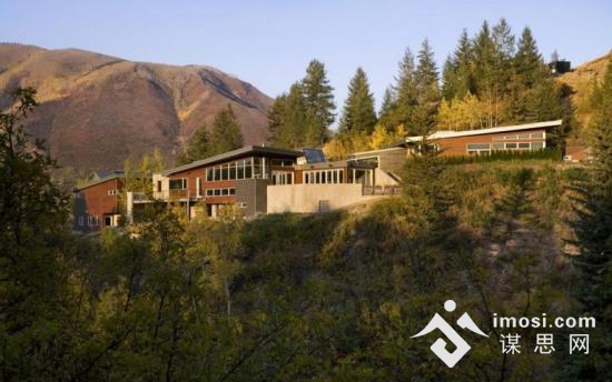 由于紧邻阿斯彭滑雪胜地,当地政府对住宅的规模和高度方面提出了严格要求。别墅分为服务、私人和公共建筑,利用地形的变化将这座占地10600平方英尺的住宅联系并统一起来。屋顶和屋檐突出的部分不仅仅可以当作一个天蓬,同时也可以反射住宅下方河流潺潺的水声。