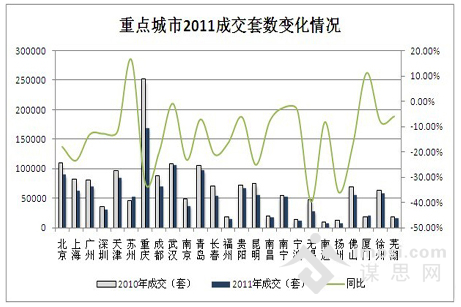 据统计,全国65个重点城市2011年商品住宅成交套数同比下跌14.39%,9成重点城市成交量下跌。成交面积同比下跌19.26%。65个重点城市中58个城市2011年成交量出现不同幅度的下跌,占比89.28%。