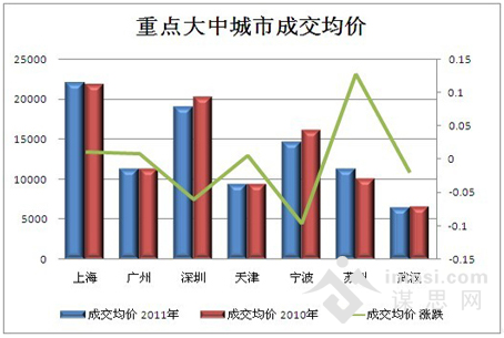 上海、广州在宏观调控的影响下,房价出现明显松动,但由于前期上涨幅度较大,2011年总体房价仍然保持小幅上涨。2011年广州成交均价同比涨幅为0.77%,上海成交均价同比涨幅1.12%,2011年上海楼市的供、求、价都创下了有数据历史的最低水平。相对于上海、广州房价的小幅上扬,深圳成交均价出现下跌,跌幅为6.03%,成交的低迷,直接导致房价的下行,以量换价的趋势已经大范围蔓延。