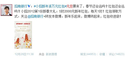 业内专家人士认为,企业在策划微博活动的时候,要根据自己的运营目的,有目标的来选择。整个活动的推广策划要符合以下几点:(以招商银行龙年元旦活动为例)