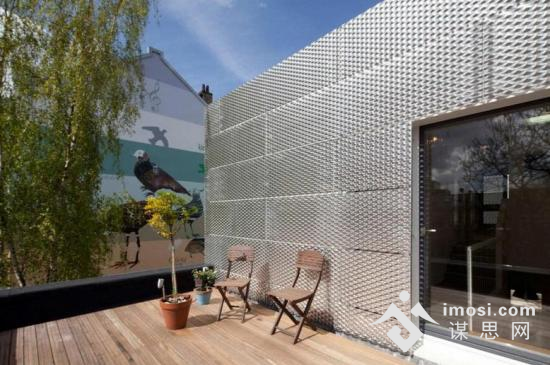把穿孔的铝板倒挂,便能给人一种封闭的感觉。这个铝板能提供一个有趣的体验:在夜晚人们能看到亮光从金属后面浪漫地透出来,而在白天,铝板则能给室内提供弥漫的日光。