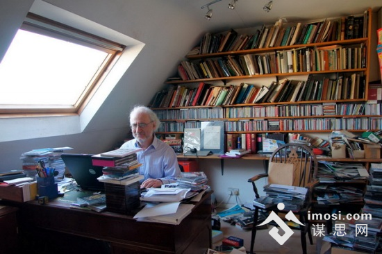 阁楼是老莱的主阵地——音乐,墙上渐渐出现了一些老版的磁带、CD和总谱。整个阁楼摆放着三张桌子,还有按照不同研究主题分类的一排排文件夹,那是助理的书桌。老莱自己的书桌就在一面天窗下,转头就可以看见无际的伦敦风景,视野一望平川,外加上安静的环境,让主人完全心无旁骛。
