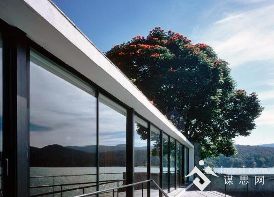 打开可以滑动的玻璃窗,能将湖面的微风更多地引入室内。每一层的空间都能直接进入户外空间——花园和避风庭院。裸露的屋顶表面形成了露台,只要站在湖边的角度观赏住宅,你就能看到白色的住宅如同丝带般蜿蜒在土坡上。