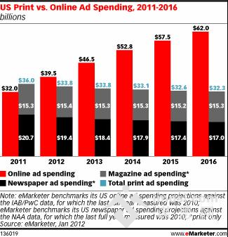 eMarketer称,由于网络广告将不断成长,而传统的报纸和杂志广告将停滞不前,未来网络广告的领先程度会不断拉大。到2016年,网络广告市场将增长至620亿美元,接近报纸与杂志广告的两倍。