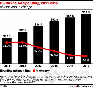 eMarketer认为,网络广告将成为媒体广告增长的主要来源,到2016年将占据美国媒体广告支出总额的三分之一左右。在此期间,电视广告仍将保持小幅增长,但传统媒体广告支出将可能出现下滑。
