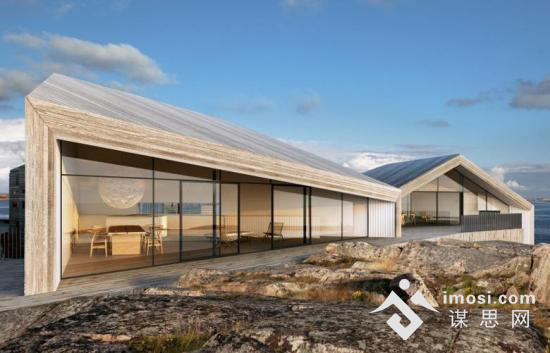 建筑跟当地特殊的地形相互映衬,显示出其独特的品味。呈三角形的建筑有着雪松木的表面并将玻璃作为主立面,与岩石的坚硬度相配,契合周围的景观,视觉震撼强烈。