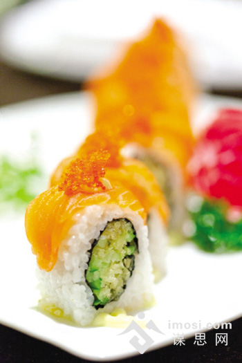 在制作寿司时,寿司醋可谓是美味的灵魂。大厨各自都有寿司醋的秘方,即使是市场购入的寿司醋,也要加入一定比例的糖和盐再次调味,酸中带微妙的甜,口感平衡温和。在干海苔上铺匀薄薄一层寿司饭,并加脆脆、黄瓜丝用竹帘成卷,切成适中大小共8件,每件放一片三文鱼生后固定,加色拉酱、蟹子点缀即成。