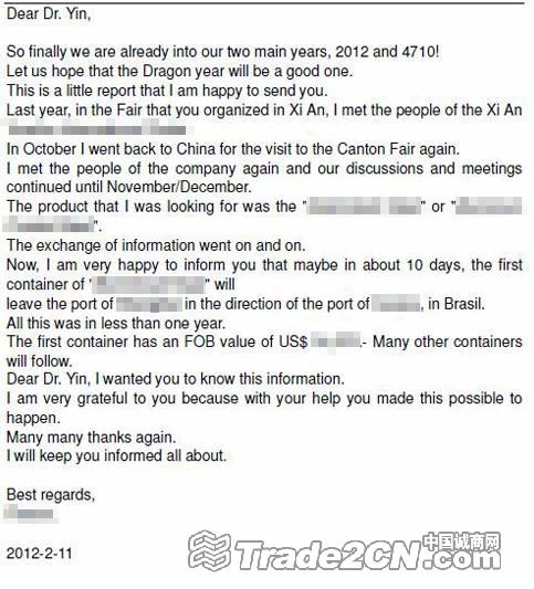 2012年2月13日中国诚商网到该采购商写来的感谢信,信中说到第一批价值3万多美金的集装箱已经准备发货,并且之后还会和此公司进一步合作,加大订单量。