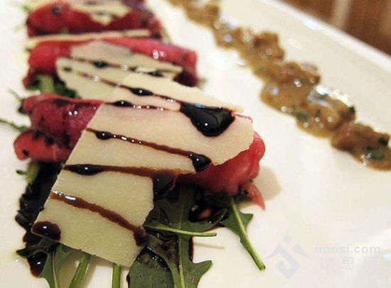 开胃菜,Carpaccio di manzo,音译为牛肉卡巴乔,诞生于威尼斯的意式生牛肉沙拉。各个餐厅对它有不同程度的演绎,但基本都是极薄的牛肉里脊片,红艳艳铺满盘,再洒以第戎芥末酱、芝麻菜、帕玛森芝士和巴萨米克黑醋。