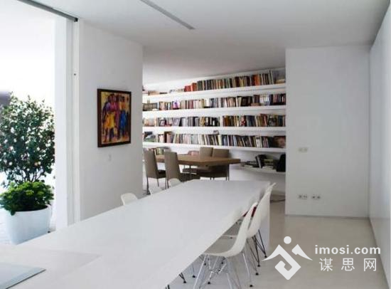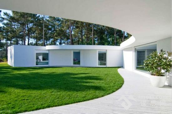 住宅周围并未设置围栏,该地块的不规则的六角形形状也能被忽略,并削弱到周围的松树林中。整个住宅如同一条白色丝带,柔和的环绕在松林中。
