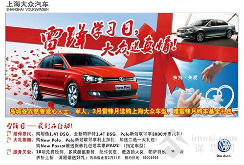记者从上海大众青岛华之杰4S店了解到,为秉承上海大众一贯的扶持与关爱精神,回馈岛城各界慈善爱心人士、军人,凡于3月学习雷锋月到青岛华之杰4S店选购上海大众车型的朋友,均可获赠雷锋月购车基金大礼包!惠民热线:0532-85032222。