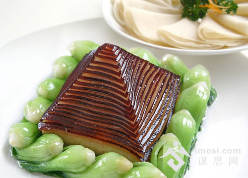俗称“宝塔肉”,造型似宝塔一般,可见厨师功底。肉片看上去很肥,却肥而浓香,夹在馍中,配天目笋干大口咬下去,肉质鲜嫩,味道浓香。