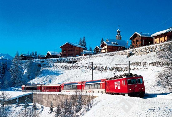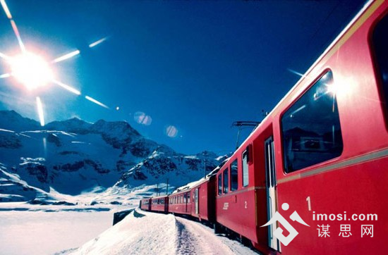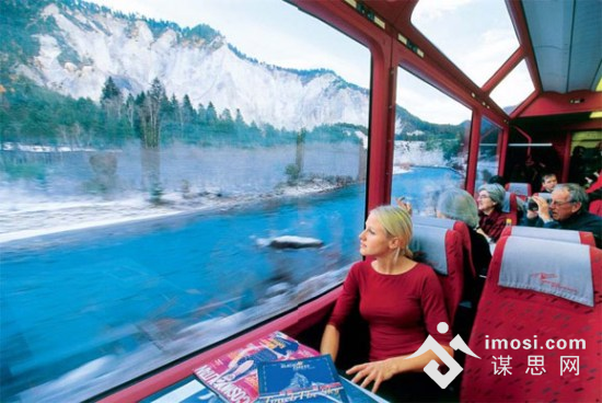 瑞士的冰川快车被称为是世界上最慢的快车,冰川快车全程需近7个半小时,途中跨越291座桥梁,穿过91条隧道,甚至翻过了上阿尔卑斯山口。乘坐冰川快车是极为难忘的行程。在远处茫茫雪山下,一列缓缓移动的红白相间的车体与蓝得耀眼的天空交相映衬,定格下你对阿尔卑斯山的印象。