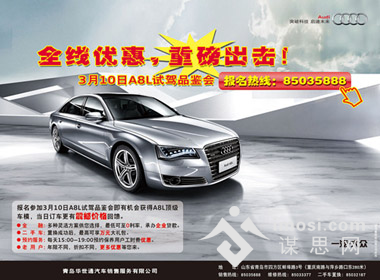记者从一汽奥迪青岛华世通4S店了解到,凡报名参加3月10日A8L试驾品鉴会的奥迪新老客户,均有机会获得奥迪A8L顶级车模,当日订车更有震撼价格回馈。报名专线:0532-85035888。