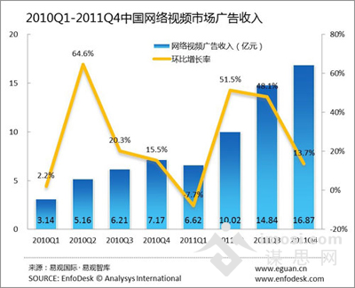 而合并后的双方业务拓展也是业内主要关注的一大焦点问题。据EnfoDesk易观智库近期发布《2011年第4季度中国网络视频市场季度监测》数据显示,2011年第4季度中国网络视频市场广告收入为16.87亿元,环比增涨13.7%,同比增长135.3%。在经历了过往两个季度大涨之后,第4季度网络视频广告增速放缓。但第4季度网络视频广告收入仍保持同比135.3%的增长。