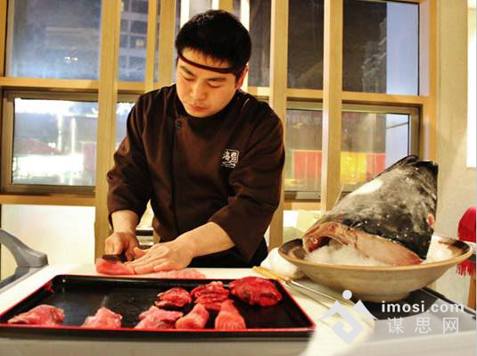 在海游,吞拿鱼最具亮点的食法在于鱼头刺身。店家所请的料理师傅均拥有至少十年的经验,当场制作鱼头刺身,动作娴熟、细致,会将鱼头不同部位的肉一一区分、切割,并向你作介绍。