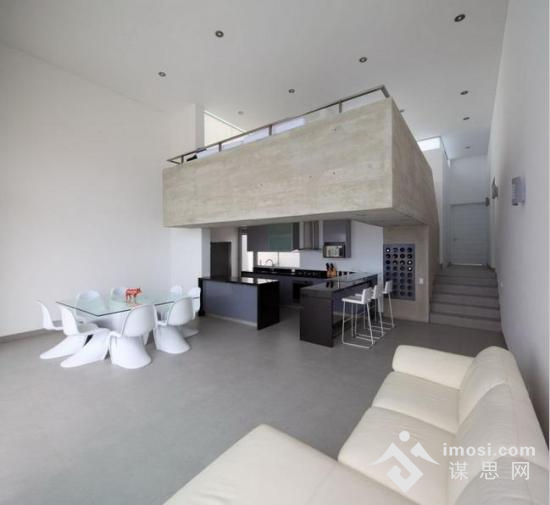 在该项目建筑设计中,设计师通过两个平行的体量,两个体量相互堆叠,它们高于地面1.2米,最大限度地开发从公共空间及主卧房到海洋一侧的视野,享受着海洋的景色;两个体量通过一个主要的流通轴线连接,以一个泳池结尾,鸟瞰海岸景色。整个场地得到最大限度地开发。