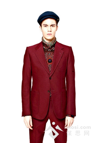 枣红色的西服套装,配搭印花衬衣有明显的异域民族风格。衬衣的颜色和西服的颜色相互呼应,矩阵图案的优雅丝巾颜色跳跃。