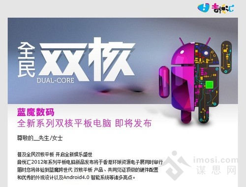国内专业的集研发生产制造于一体的著名平板电脑厂商蓝魔数码今日宣布,将于4月13日于香港发布旗下全新三款双核平板产品。蓝魔数码拥有领先的工业设计与研发制造能力,从2009年开始便开始切入android平品的研发和制造,是国内领先的平板电脑品牌厂商。