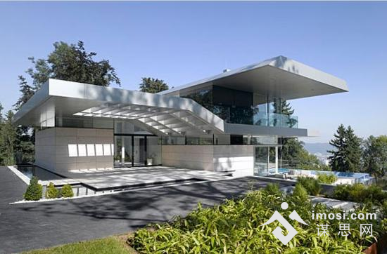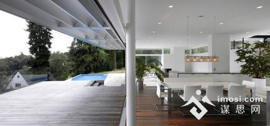 该豪宅拥有一个扩展悬臂式的屋顶,是钢梁和铝面板合成的网格结构。穿过小池塘,在未完全进入中央庭院的时候,便可一睹林茨的壮丽全景。穿过从带开放式厨房的餐厅即可到达中央大厅。而另一面是有供休息的沙发或者躺椅的休闲空间,有俯瞰城市和泳池的视野。建筑师意图能够建立一个多功能的开放生活区。此外,豪宅里大型滑动玻璃元素模糊了室内和室外空间的界限。卧室位于楼上,通向卧室的楼道就像是一个开放式的画廊。