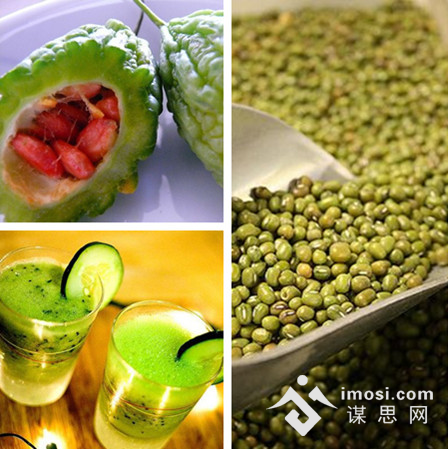 苦瓜绿茶饮清热解毒:苦瓜一个、绿茶适量。将苦瓜的一端切开取出瓜瓤:然后在其中装入绿茶。将装有绿茶的苦瓜挂于通风处阴干。再将阴干后的苦瓜(要将其外部洗净、擦干)连同其内部的茶叶一起剁成碎末。然后贮存于瓷罐中。每次饮用时取10克用200毫升的沸水冲泡即成。可每日饮用数次。此茶饮具有清热解毒功效,尤其适合有肝火旺盛人群饮用。