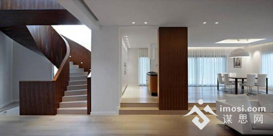 该住宅依据地形建造,分两部分,共三层,其中斜坡下层以石材和混凝土打造的住宅底座,起到一个辅助过渡的作用,地上两层则以白色立面呈现,干净清新。建筑体量中间的螺旋楼梯以木材包裹,雕塑般曲面以一种异常柔软的方式在垂直的住宅空间中呈现,成为设计中最惊艳的元素。