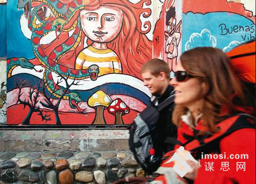 沿着圣马丁大街往西漫步,沿街有不少服装店和户外用品店,再往西走,则是一个尖顶教堂,行人渐渐稀少了,街边的墙上有不少涂鸦,上面有黑蛇绕头的孩子,有抚琴吟唱的流浪歌手,还有神情不屈的土著老人,充满着拉美魔幻主义的风格。从1896年起,囚徒被长途押送到这里,1920年,这里修建监狱。在20世纪前半叶的大部分时间,这个小城以关押重刑犯的监狱而闻名,因为这里是如此遥远,以至于逃跑成为了不可能的任务。而现在,这里成为了前往南极和巴塔哥尼亚旅游的门户。