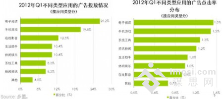 2012Q1移动应用广告平台的应用类型分布中,电子阅读、手机游戏、在线影音三类应用的广告投放比例最高。艾瑞分析认为,在目前所有应用中,电子阅读、游戏类应用是属于用户停留时间较长的两类应用,因此,广告主投放的意愿也比较长。