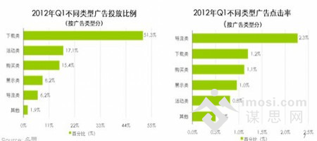投放移动广告逐渐成为倍受广告主青睐的选择。根据一项广告领域调查数据显示,在2012年一季度移动应用广告的广告主类型分布中,电商类、工具类、快消类广告主居于领先地位,分别占据29%、22.6%、14.1%;而从广告点击率情况来看,游戏类、新闻类、娱乐类居于前三甲,分别为2.3%、2%、1.3%。