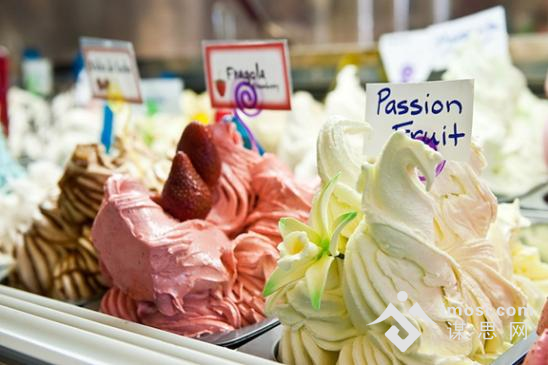 令Gelato绵密的另一个原因是其水分含量很少。冰激凌因为需要有固定的形状,需借助水分冰冻后结成的小冰粒来固定其他配料,因此它的水分含量基本和空气含量差不多。冰沙更不用说,入口的瞬间,大量的碎冰粒在口腔的温度作用下就会成了水。Gelato的原料是坚果、时令水果、鸡蛋和牛奶,除此之外不会加进水,用水果做的Gelato相对水分含量比较高,但这些水分是来自水果本身的。