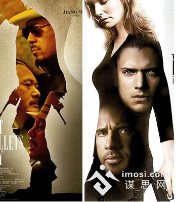 笔者通过对比发现,红极一时的影片《让子弹飞》,其中的一款海报打出了几个镂空的字:“让子弹飞”,字中隐约出现几位主演严肃的面孔,被指与莱昂纳多主演的《无间道风云》海报设计相似。而利用剪影融入周润发等人物的海报,被指与《越狱》的海报如出一辙。还有2009年《非常完美》的海报被指抄袭《为你疯狂》,黄磊的《老男人历险记之气喘吁吁》海报,拿着一半杂质构成男主角脸的另一半,和电影《总统杀局》的海报几乎可以说是神似。这些创意设计的产品严格来说,或多或少的都构成了一定的侵权。
