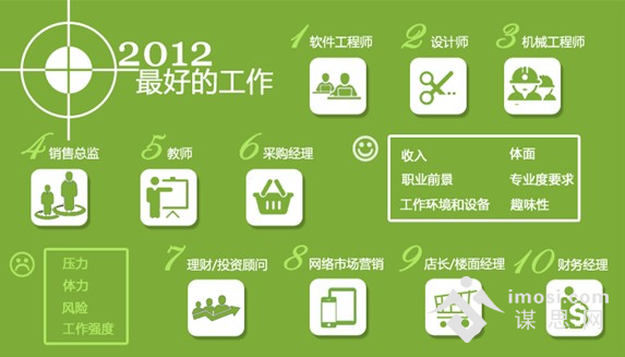 前程无忧以其网站www.51job.com在2012年1-5月招聘需求最大50个职位为候选。设立了收入、职业前景、工作环境和设备、体面、专业度要求和趣味性六大正向维度,又以压力、体力、风险和工作强度为四大负向维度,选出软件工程师、设计师、机械工程师、销售总监、教师、采购经理、理财顾问、网络市场营销、店长/楼面经理和财务经理。前程无忧首席人力资源专家冯丽娟说,最好职业的排行反映了今天的求职者对工作的价值取向,也反映了2012雇主的人才需求。