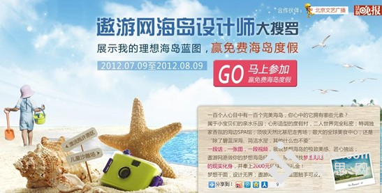 为进一步打造海岛度假文化,推介特色海岛旅游产品,2012年7月10日,中青旅遨游网在京宣布,本年度7-8月份,遨游网将与法制晚报、北京文艺广播强强联手,推出大型互动活动“遨游网海岛设计师大搜罗”。