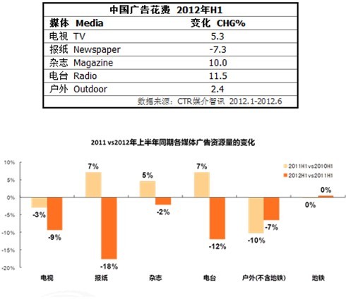在复杂严峻的国内外经济环境下,2012年中国经济增速回落,上半年GDP同比增长7.8%,二季度增长7.6%,创三年来新低。宏观经济指数的下滑对广告市场造成严重冲击,据权威研究机构CTR最新发布的《2012年上半年中国广告市场回顾》显示,上半年传统媒体的广告刊例花费同比增长3.9%,增幅为近五年最低。