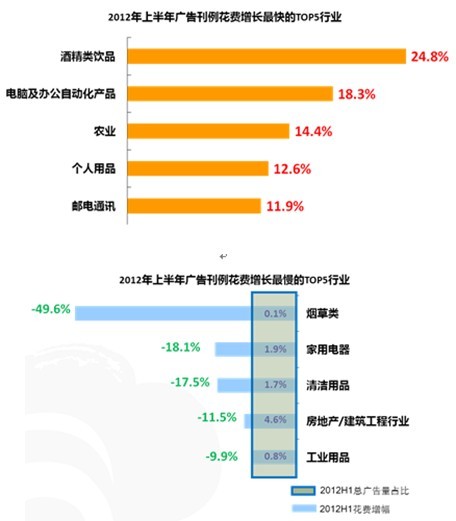 2012上半年对广告市场贡献最大的两大行业是化妆品/浴室用品和酒精类饮品。化妆品/浴室用品行业稳定增长,广告花费同比增幅7.8%,其他主力行业的花费增幅较去年同期有所减缓。酒精类饮品的市场竞争加剧,行业投放量持续增长,广告花费增幅为24.8%。