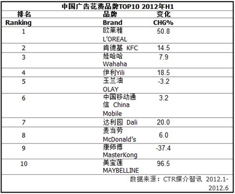 2012上半年,欧莱雅以高增长稳坐传统媒介投放首位,增幅为50.8%。而玉兰油同比减投3.2%,排名第五。美宝莲广告投放虽排名第十,但增幅高达96.5%,是TOP10品牌中增幅第一大的品牌。饮料行业称霸品牌榜,四大品牌娃哈哈、伊利、达利园、康师傅跻身广告投放额前十榜单,竞争更显激烈。其中康师傅的广告投放额出现下滑,降幅为37.4%,广告预算呈现紧缩态势。