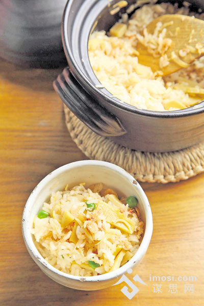 至于“竹笋樱花虾饭”就有点像日本煲仔饭了,用上了日本铁釜来煮,受热均匀。这笋饭要做得好,关键在于用鲣鱼高汤煲饭,高汤的调味要非常精准,这样才能突显笋片的清甜。饭里还加入了切粒的日本豆腐(类似于炸面筋),所以整煲饭吃起来口感过瘾。