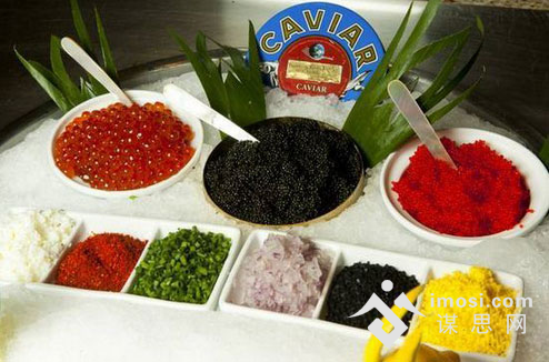 鱼子酱吧的选择不少,包括美洲鲟鱼鱼子酱,飞鱼籽及鲑鱼籽,定价38美元(约合人民币236元)。