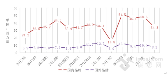 2013年6月份,国内品牌手机出货量3431.1万部,占手机总出货量的80.8%;上市新机型249款,占手机上市新机型总量的95.0%0 3G手机中,国内品牌出货量份额分别为:TD-SCDMA手机88.9%, WCDMA手机54.4%,cdma2000手机71.2%。